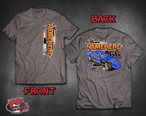 This custom dirt modified T-shirt  is part of our Eliminator series. It features the driver name, number and a car illustration. These are full blown custom racing shirts, and all of our shirts are printed with the latest technology in Direct to Garment printing. This allows us to offer very low quantities at very competitive prices. We use only 100% cotton T-shirts. This gives us the finest print quality along with the most comfortable wearing shirt. Many of these designs feature the car with your number style and sponsors. If you would like your wrap design, number style and sponsors on your shirts you will need to email us a file with this artwork. If you do not have the files, your wrap or decal company should have them.Please send that to info@p3graphix.com.