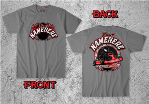 This custom racing kart T-shirt  is part of our Eliminator series. It features the driver name, number and a car illustration. These are full blown custom racing shirts, and all of our shirts are printed with the latest technology in Direct to Garment printing. This allows us to offer very low quantities at very competitive prices. We use only 100% cotton T-shirts. This gives us the finest print quality along with the most comfortable wearing shirt. Many of these designs feature the kart with your number style and sponsors. If you would like your wrap design, number style and sponsors on your shirts you will need to email us a file with this artwork. If you do not have the files, your wrap or decal company should have them.Please send that to info@p3graphix.com.