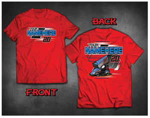 This custom racing kart T-shirt  is part of our Eliminator series. It features the driver name, number and a car illustration. These are full blown custom racing shirts, and all of our shirts are printed with the latest technology in Direct to Garment printing. This allows us to offer very low quantities at very competitive prices. We use only 100% cotton T-shirts. This gives us the finest print quality along with the most comfortable wearing shirt. Many of these designs feature the kart with your number style and sponsors. If you would like your wrap design, number style and sponsors on your shirts you will need to email us a file with this artwork. If you do not have the files, your wrap or decal company should have them.Please send that to info@p3graphix.com.
